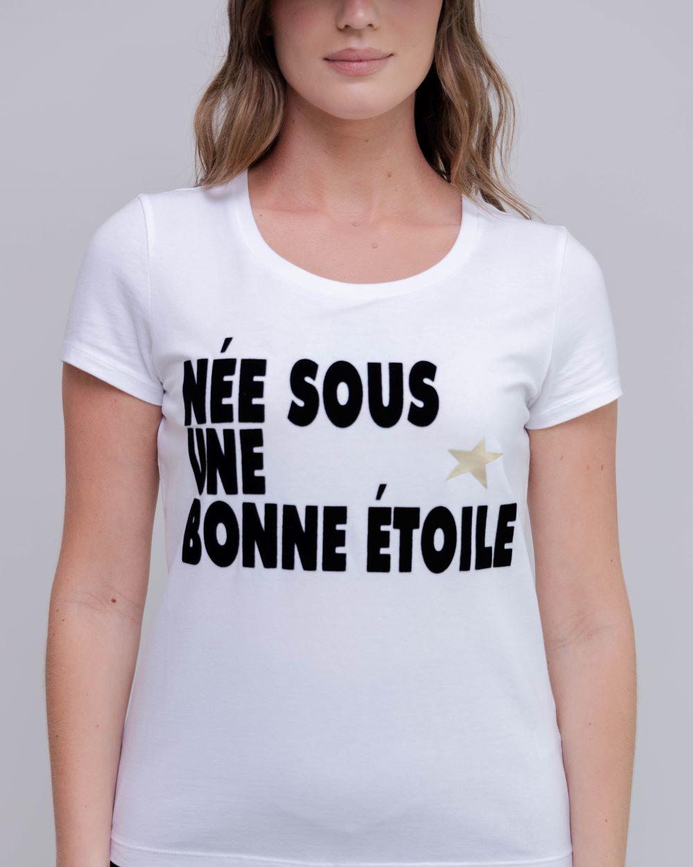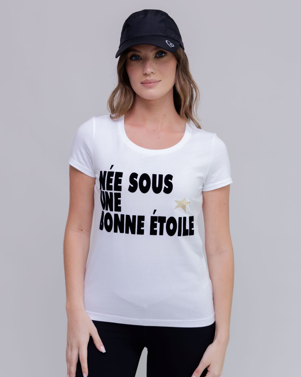 Experience the ultimate blend of glamour, confidence, and comfort with the Metaglam Bonne Etoile White Cotton T-Shirt. Made from luxurious Peruvian cotton, this soft-feeling shirt is crafted for those who value style and versatility. With a chic Black  flock design that embodies Nee Sous Une Bonne Etoile , this T-shirt is ideal for any sport, whether you’re climbing, playing tennis, or enjoying a game of pickleball.