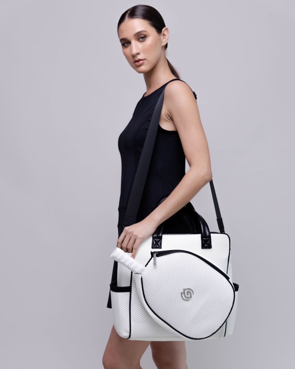 Includes 1 detachable and adjustable luxe trim crossbody strap to be used on tote or racket bag
